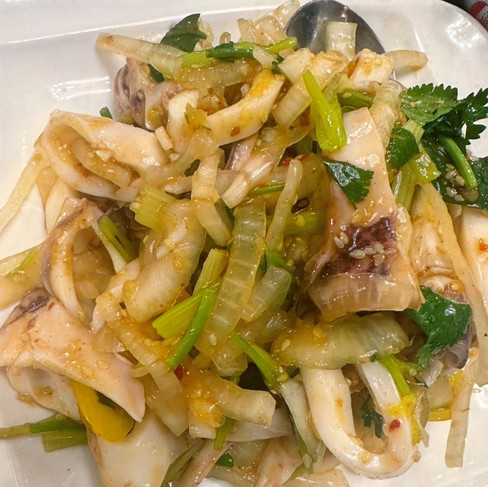 接下來上了幾道小菜,說是小菜其實是相比之前的盤子稍微「小一點」,但菜色一樣豐盛到你會怕!「鮮蔬炒花枝」,甜美的洋蔥和新鮮嫩Q的花枝搭配,清爽好吃!「嫩筍牛肉絲」,切成細絲的嫩筍和牛肉絲一起,微辣清脆的口感,既開胃又下飯(但此時胃已裝不下飯了)。